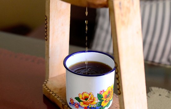 Debajo de la bolsa donde se vierte el café, esta una taza que chorreará hasta vaciar la misma, de esta manera, es una particular forma de disfrutar de un buen café tico.